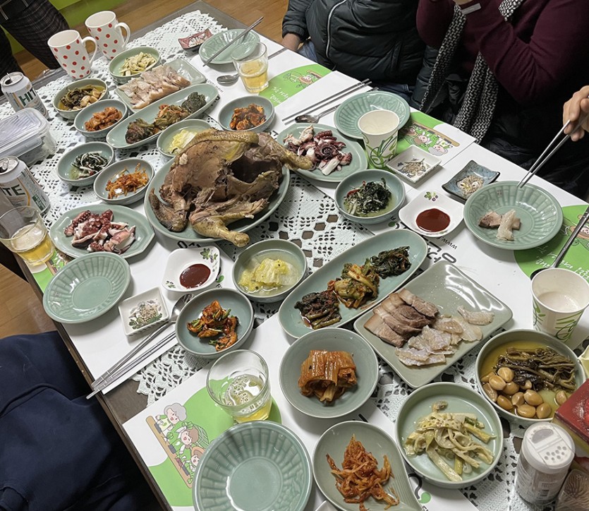 끝도 없이 펼쳐져 있는 감나무들을 보며 그 풍경에 취해 감도 따보고, 숲에 노니는 닭들과 개, 고양이를 보며 즐거워 하던 중 사장님은 어느새 직접 잡으신 닭으로 백숙을 준비하셨다. 그로부터 시작되어 매일 아침 계속되는 진수성찬! 남도의 음식이 왜 유명한지 알게 되었고, 바지락의 여왕이신 정사장님의 반찬솜씨는 여행은 집어치우고 요리강습을 받고 싶은 충동이 들게 하였다. 게, 조개, 고기, 병어, 굴비, 장어, 각종 나물로 이어지는 훌륭한 식사와 간식까지 사장님의 진심어린 배려와 사랑으로 존재하는지 몰랐던 입맛까지 살아나, 염체불구하고 포식을 하는 일주일이 계속되었다.